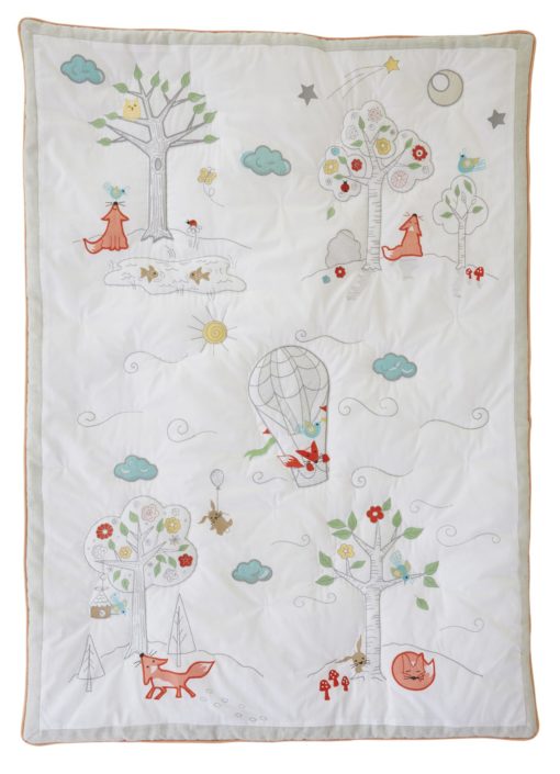 The LIMITED EDITION Fox and the Finch quilt has beautifully hand crafted appliqués and embroideries of the Fox and Finch adventures. Individual scenes are intricately embroidered to show each episode of the Fox and the Finches fantastic journey. All natural 100% cotton white ground is framed with high quality linen in soft grey. Delicately hand quilted around the trees and each scene. This versatile quilt can be used as a nursery wall hanging with pole pocket on reverse, as well as a toddler quilt. In the true spirit of heirloom quality, this incredibly detailed quilt can be passed down in the family for generations. Also perfect for monogramming and personalizing.